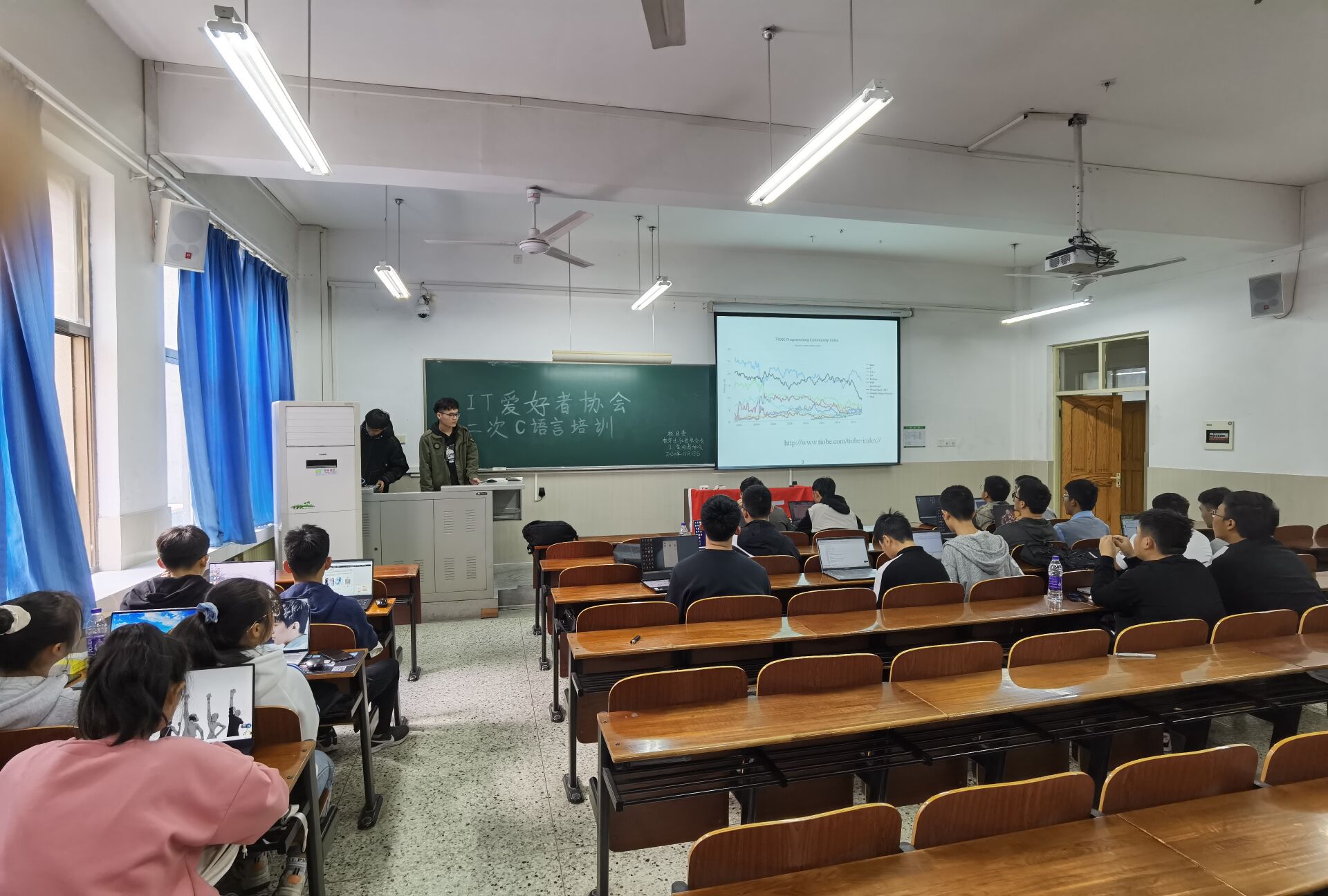 培训第一项由副会宣布本次C语言培训开始;其次,邀请到两位新校区的两位同学对本次培训进行指导,借由ppt对C语言的由来、历史、发展等进行介绍,同时通过程序的编写对参赛人员进行教学指导;接下来,对参赛人员的提问进行解答,并传授自身经验;然后,播放往期比赛的优秀作品;接着,进行实际操作并给出一些作品上的建议;最后,由副会鼓励大家勇敢迈出第一步,参与C语言情书大赛,提升自身能力。
